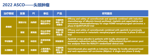 在头颈肿瘤领域,2022 ASCO已接收2篇采用“双艾”方案治疗鼻咽癌的研究,分别在壁报讨论和壁报环节展示,另有2篇壁报,分别为阿帕替尼治疗甲状腺癌REALITY研究事后分析和“双艾”治疗头颈鳞癌的研究。