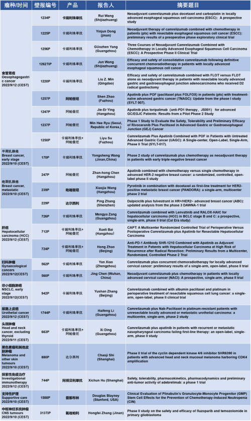 作为从事创新和高品质药物研发的国际化制药企业,PA视讯医药的研究成果在2022 ESMO大会上还收获了25项壁报形式的报告。其中,食管胃癌领域共有9项研究入选,研究的方案主要是卡瑞利珠单抗或卡瑞利珠单抗联合阿帕替尼,通过与化疗或放化疗联用,新辅助治疗食管鳞癌或胃癌。2022年9月12日(CEST),让我们齐聚ESMO大会,共同领略食管胃癌研究领域的学术盛宴。此外,PA视讯医药达尔西利、吡咯替尼、阿得贝利单抗等创新药还有4项乳腺癌研究、3项肝癌研究及其他领域的9项研究都将会以壁报展出,让我们共同期待!